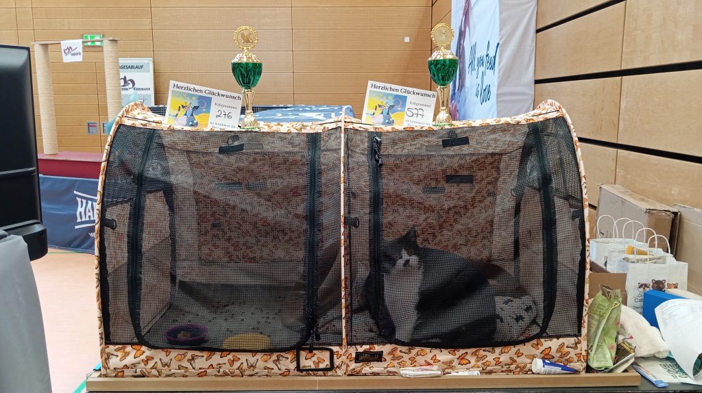 Evelyn hat ihren dritten Punkt zum CAC bekommen und darf sich nun als Champion betiteln. Am Sonntag gab’s dann noch einen Punkt für den CACIB, die nächste Klasse. Sie hat an beiden Tagen einen Sonderpreis erhalten 😻
